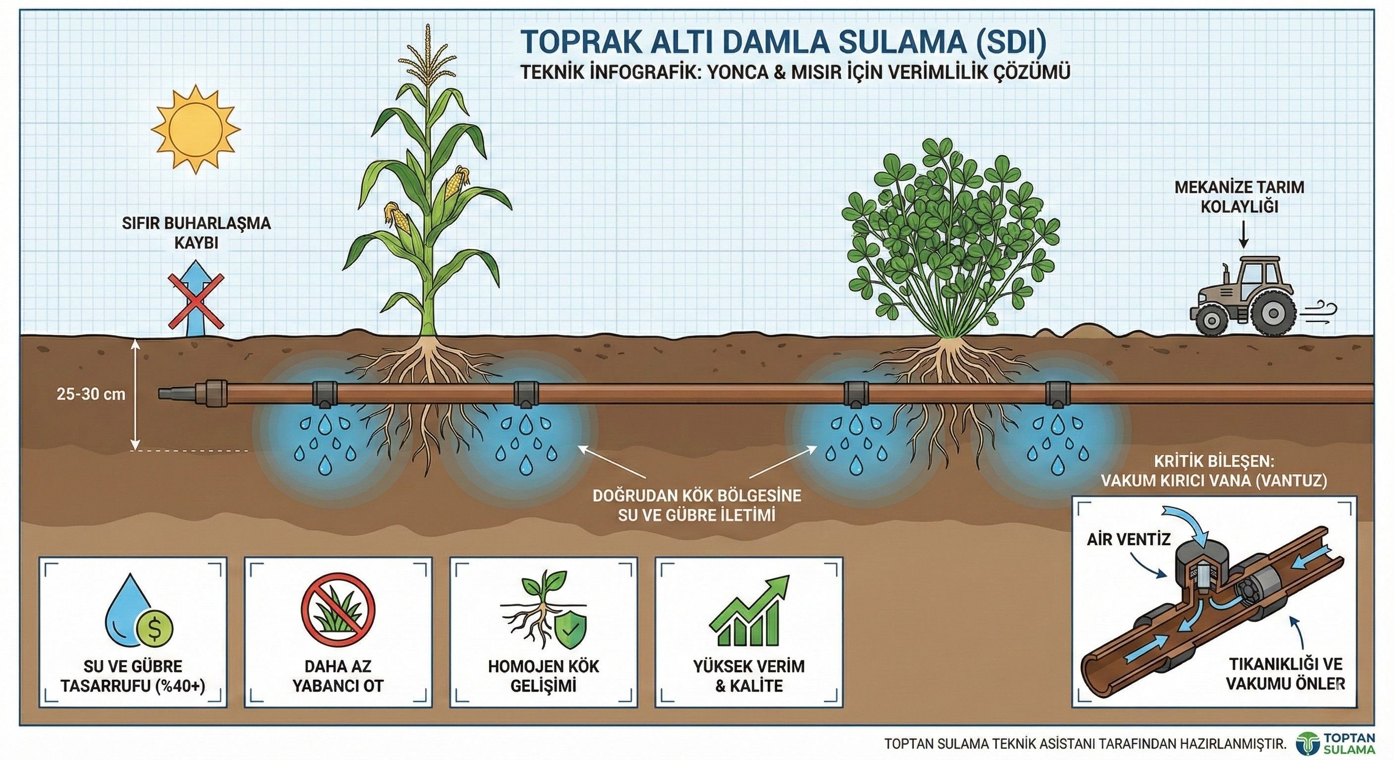 Giderek azalan su kaynakları ve artan girdi maliyetleri, tarımda inovasyonu zorunlu kılıyor. Toprak Altı Damla Sulama (SDI), damla sulama borularının toprak altına belirli bir derinliğe gömülerek suyun ve besin maddelerinin doğrudan bitki kök bölgesine verilmesi işlemidir. Özellikle yonca ve mısır gibi yoğun su isteyen ürünlerde bu sistem, karlılığı maksimize eder.