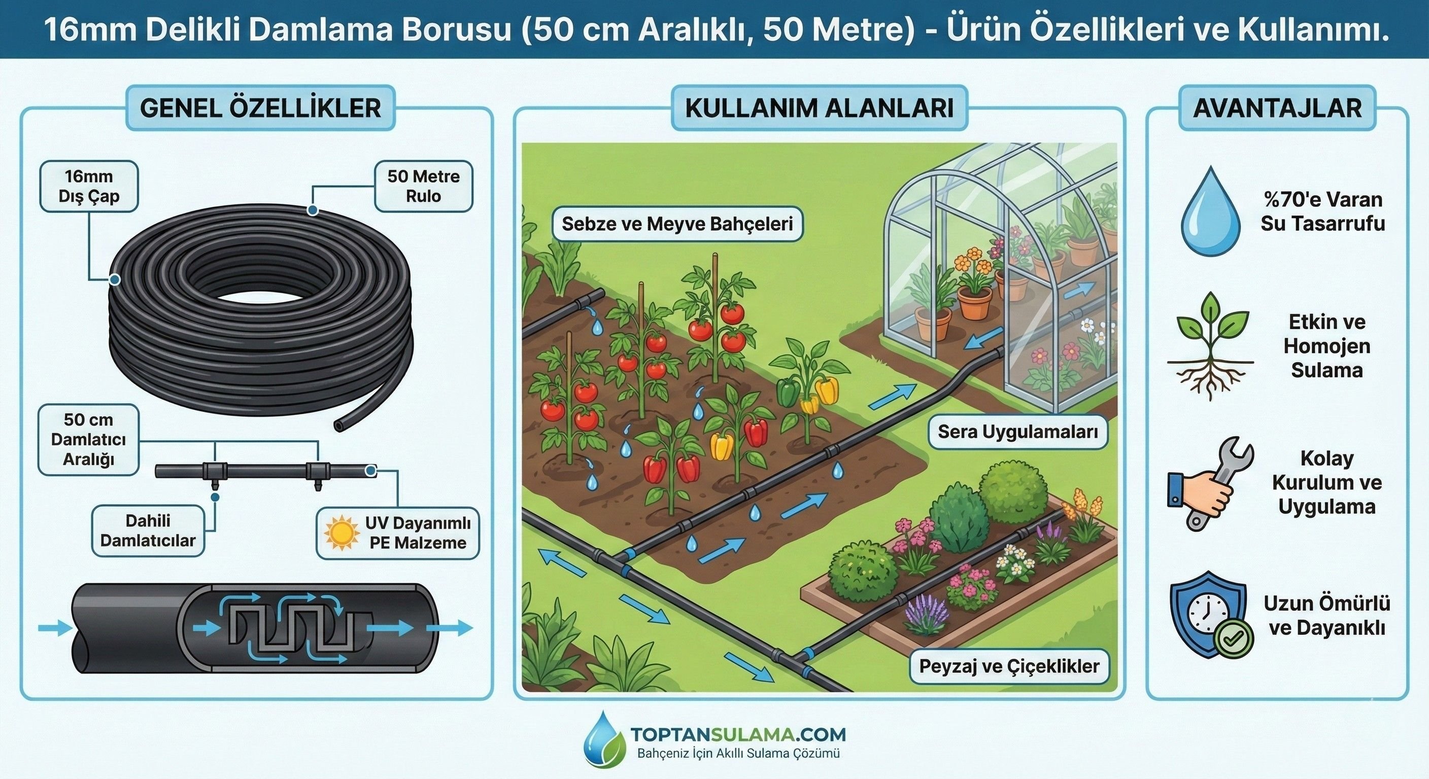 - Kullanım: Sıra/şerit sulama (bahçe, sera, peyzaj)