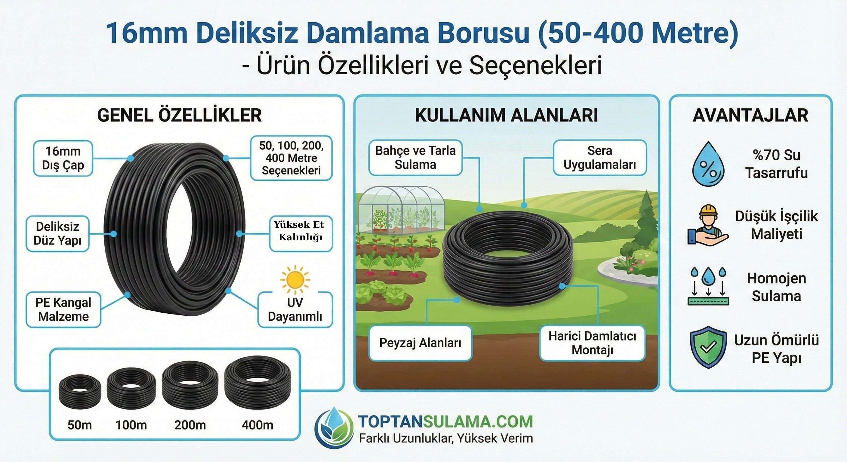 Deliksiz (boş) 16mm damlama borusu, damlatıcıların aralığını hazır almak istemeyenlerin borusudur. Damlatıcıyı nereye istersen oraya takarsın; ağaç, fidan, saksı dizilimi, sera sıraları… Hepsine uyum sağlar. Ürün UV katkılı, esnek PE (polietilen) yapıdadır ve 16mm dış çap standardı sayesinde piyasadaki 16mm ek parçalara uyumludur.