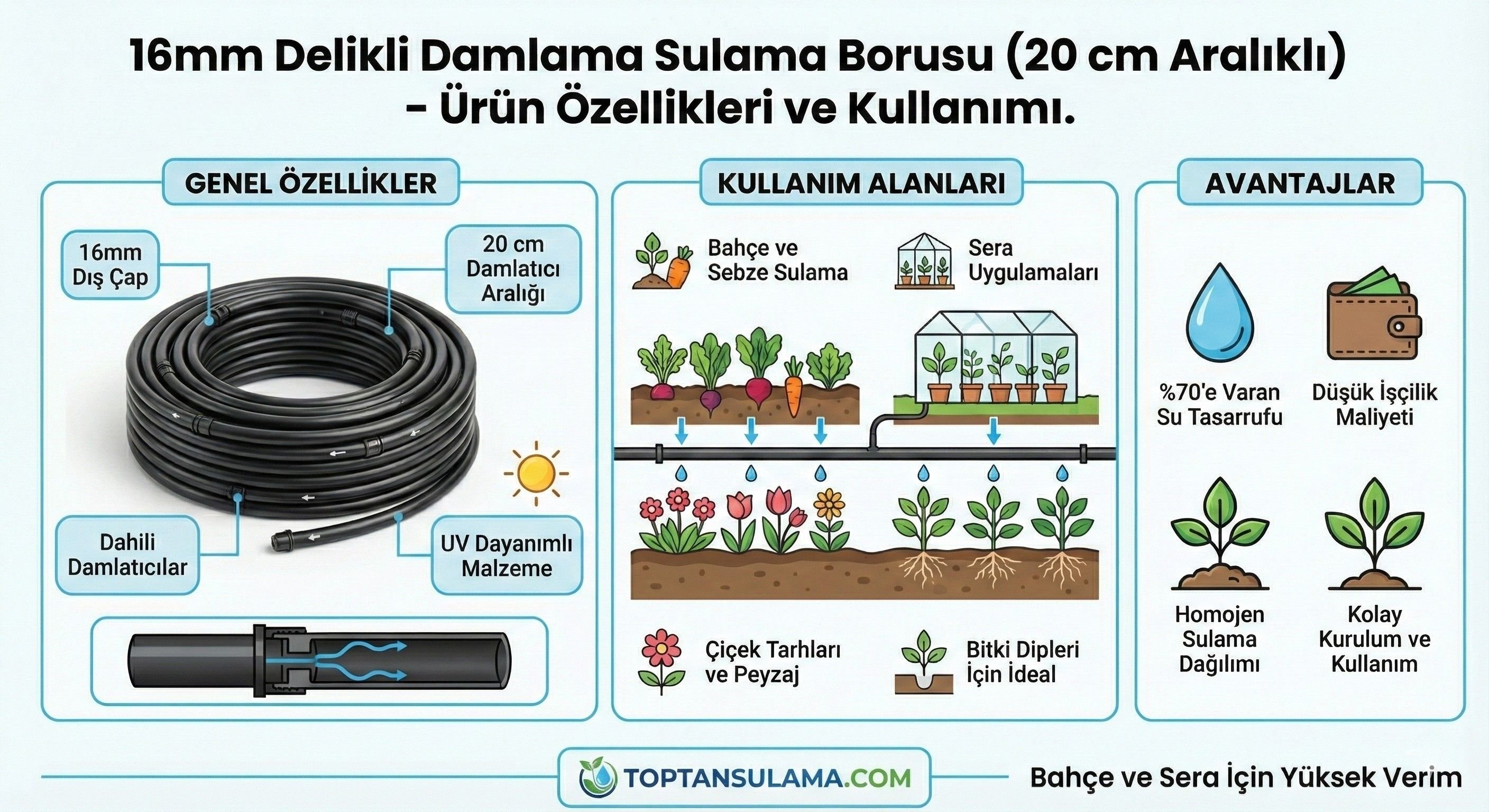 Bu **Kaplamalı Damlama Sulama Borusu**, ticari ve yoğun ekim uygulamaları için tasarlanmış, **16 mm** çapında yüksek performanslı bir borudur. Borunun en dikkat çekici özelliği, damlatıcıların **sadece 20 cm aralıklarla** yerleştirilmiş olmasıdır. Bu ultra sık aralık, özellikle kök sistemi yüzeysel olan ve birbirine çok yakın ekilen bitkilerde suyun toprakta mükemmel bir şekilde örtüşmesini (overlap) ve homojen dağılmasını sağlar.
